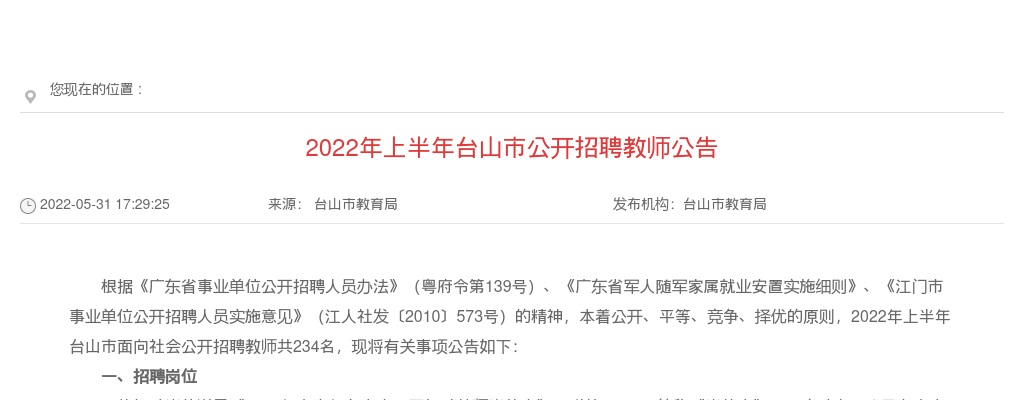 原标题:2022年上半年台山市公开招聘教师公告